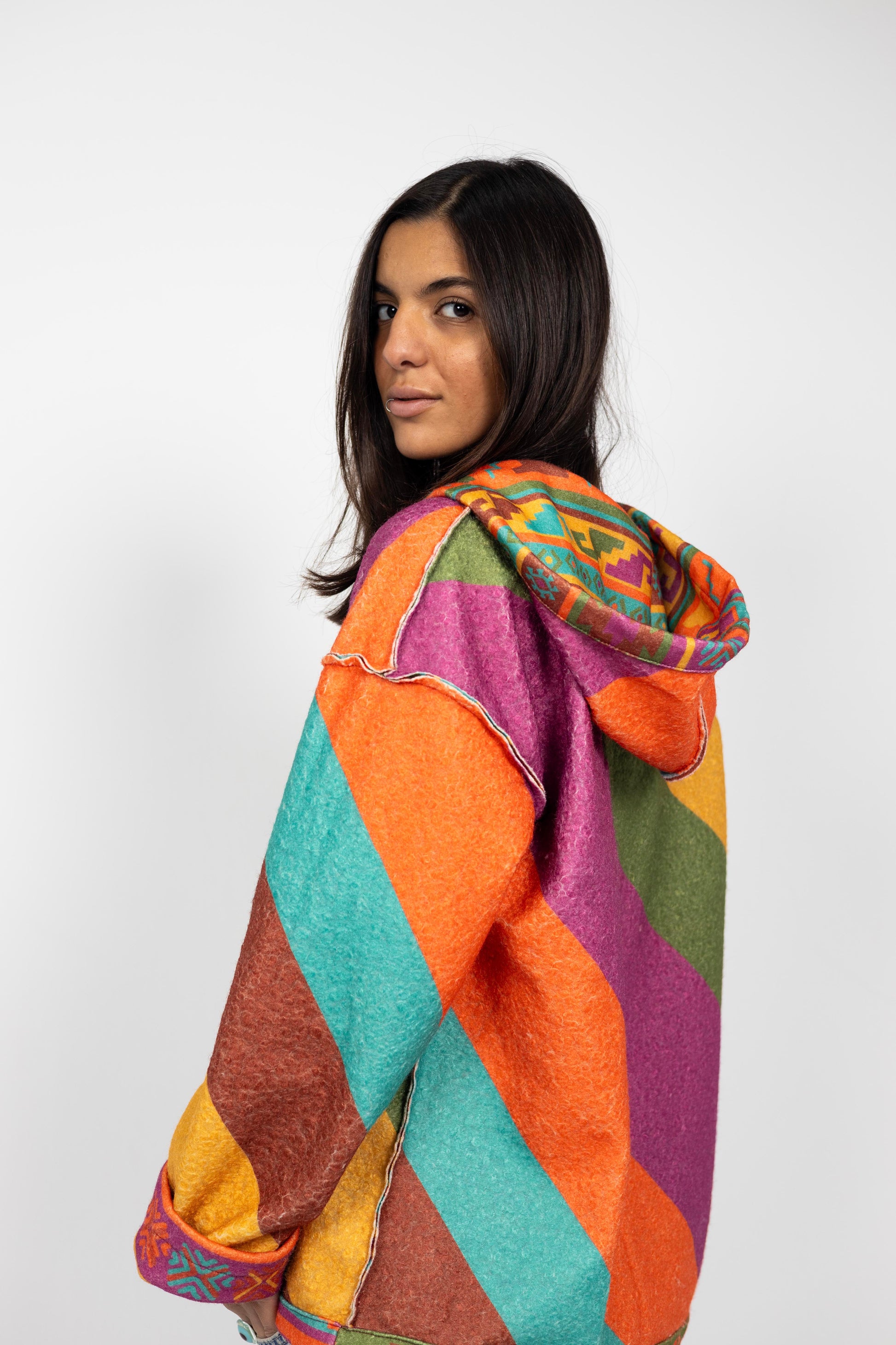 The "Flocons et bonbons" reversible hoodie is a statement hoodie, a mix between comfort and playfulness. It has a relaxed silhouette, with a cordon from the bottom to adjust its length. The material is fluffy to keep you warm in the coldest winter days.