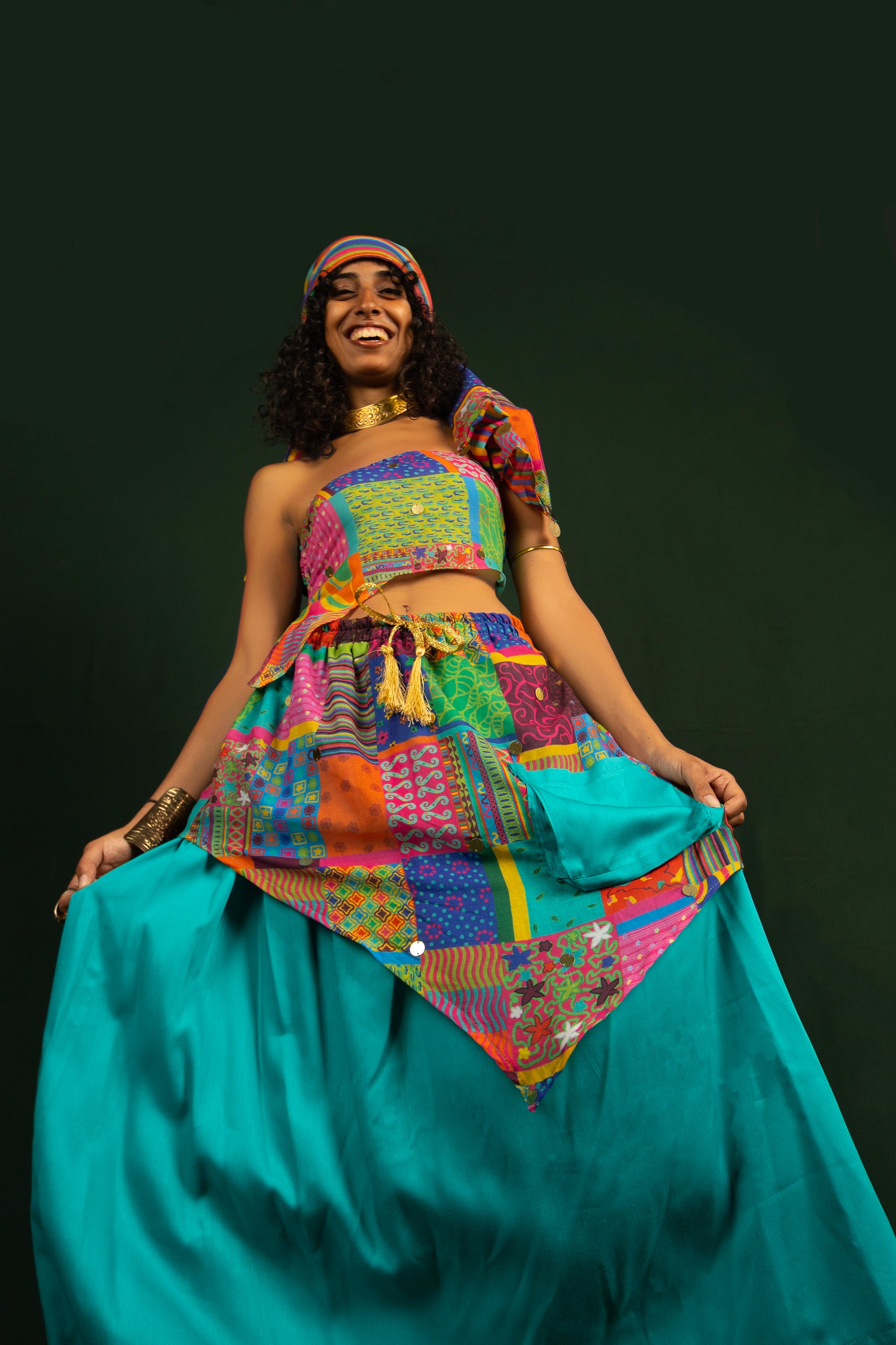 Our jaw dropping gypsy skirt is something to love now and wear on repeat. It’s the loveliest coolest match to all your tops. It’s made of 100% Egyptian viscose, with a polyester patterned asymmetrical layer, with small dangling copper discs, and a gold-ish adjustable elastic waistband with tassels. It’s free size, so the perfect look is guaranteed. (The perfect fit for it is our asymmetrical crop top <3)