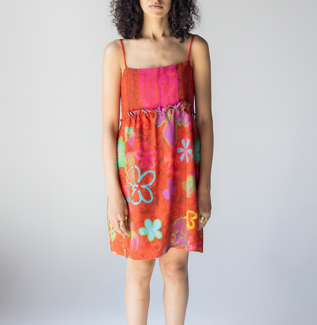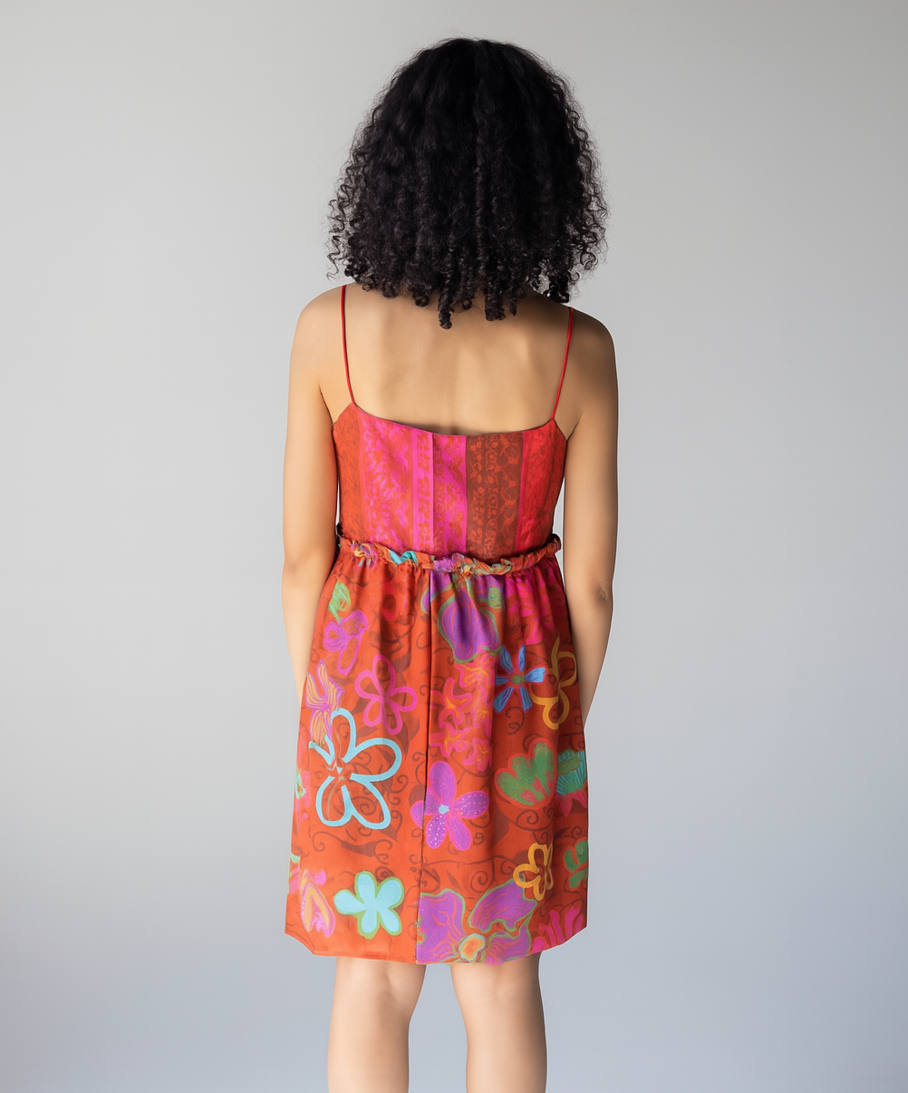 Step into our Not-So Secret Garden Mini Dress featuring a square neckline stripped in red and fuchsia. And a flowy silhouette from the waist in a vibrant floral pattern with a bold red background. It evokes a very feminine and girly look. And it has adjustable straps in the same color with a dangling tassel for a more playful look.
