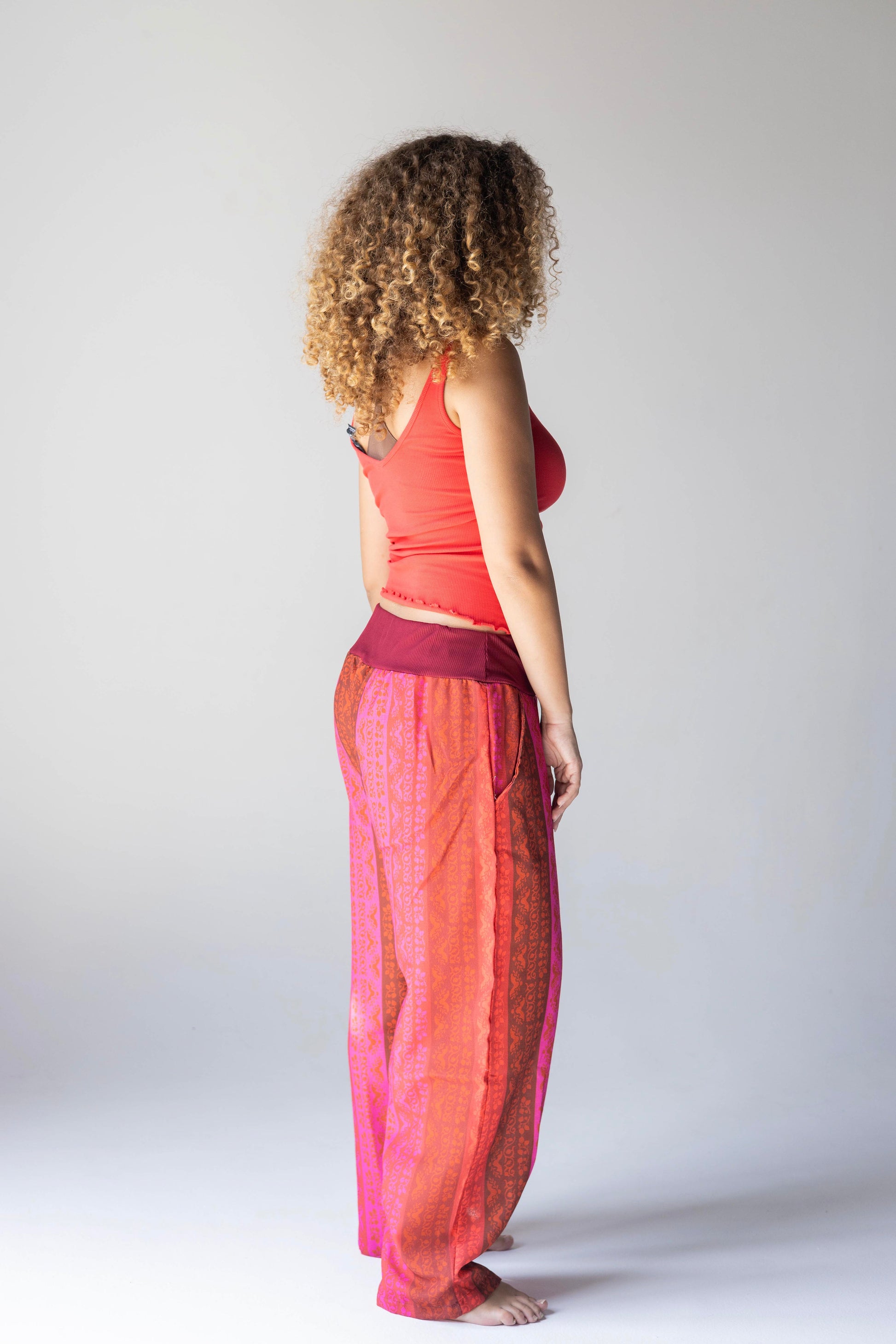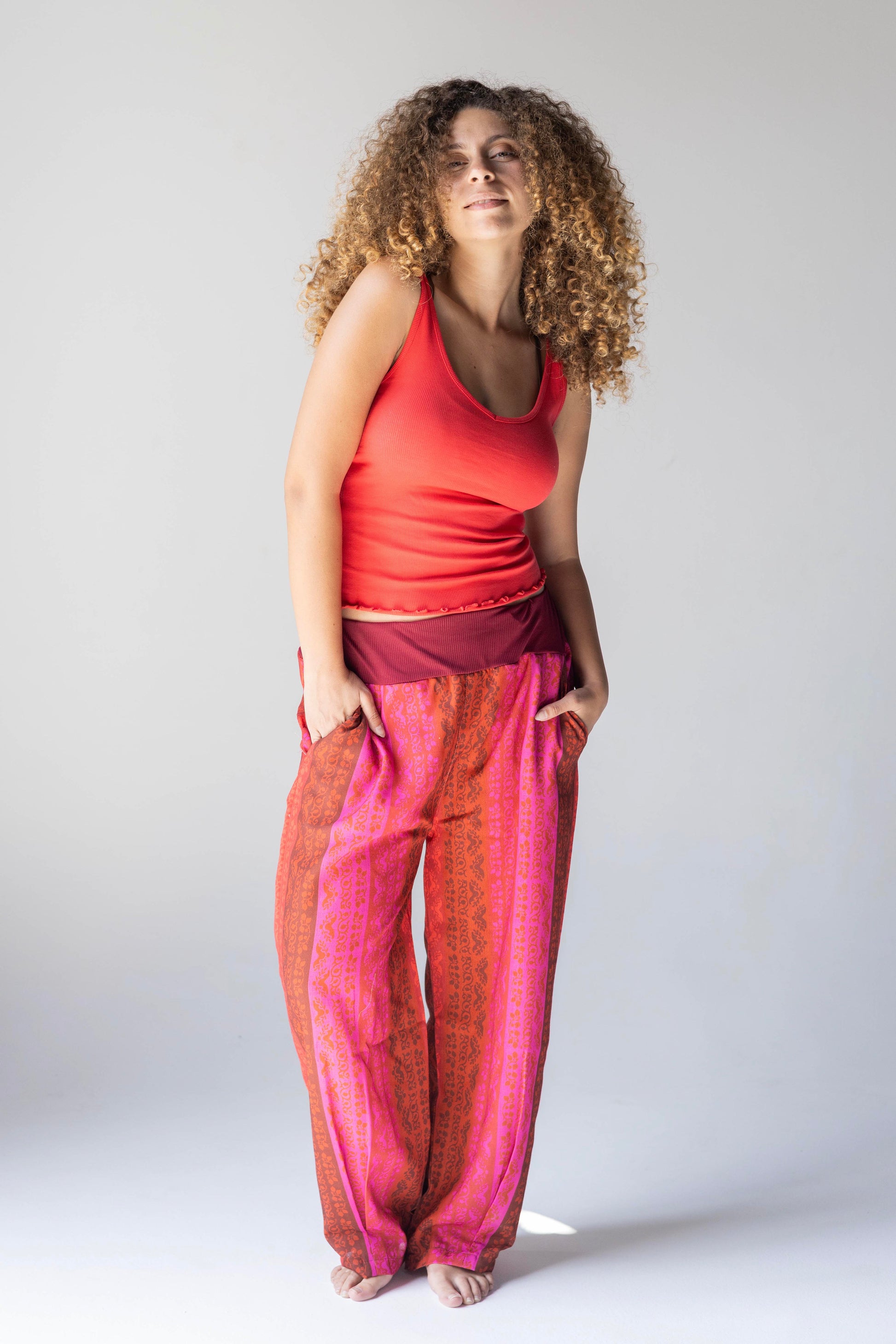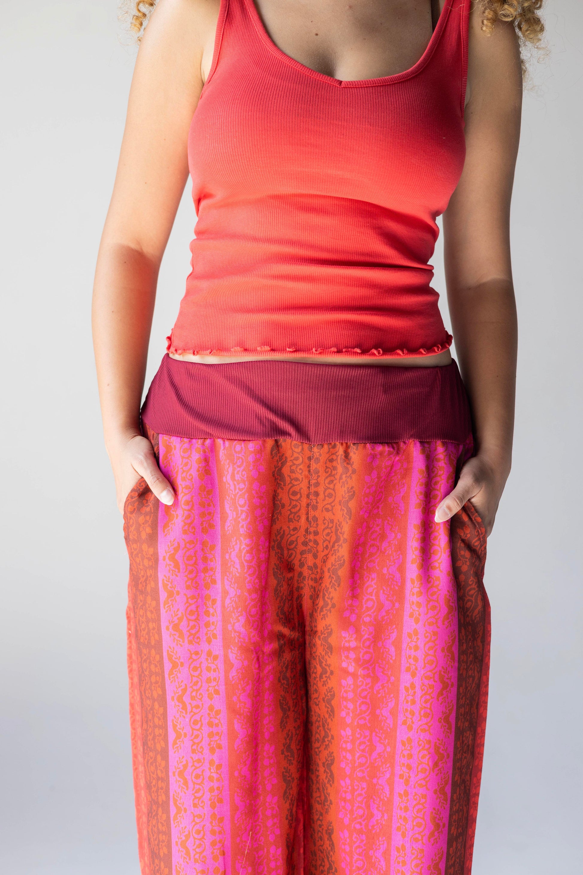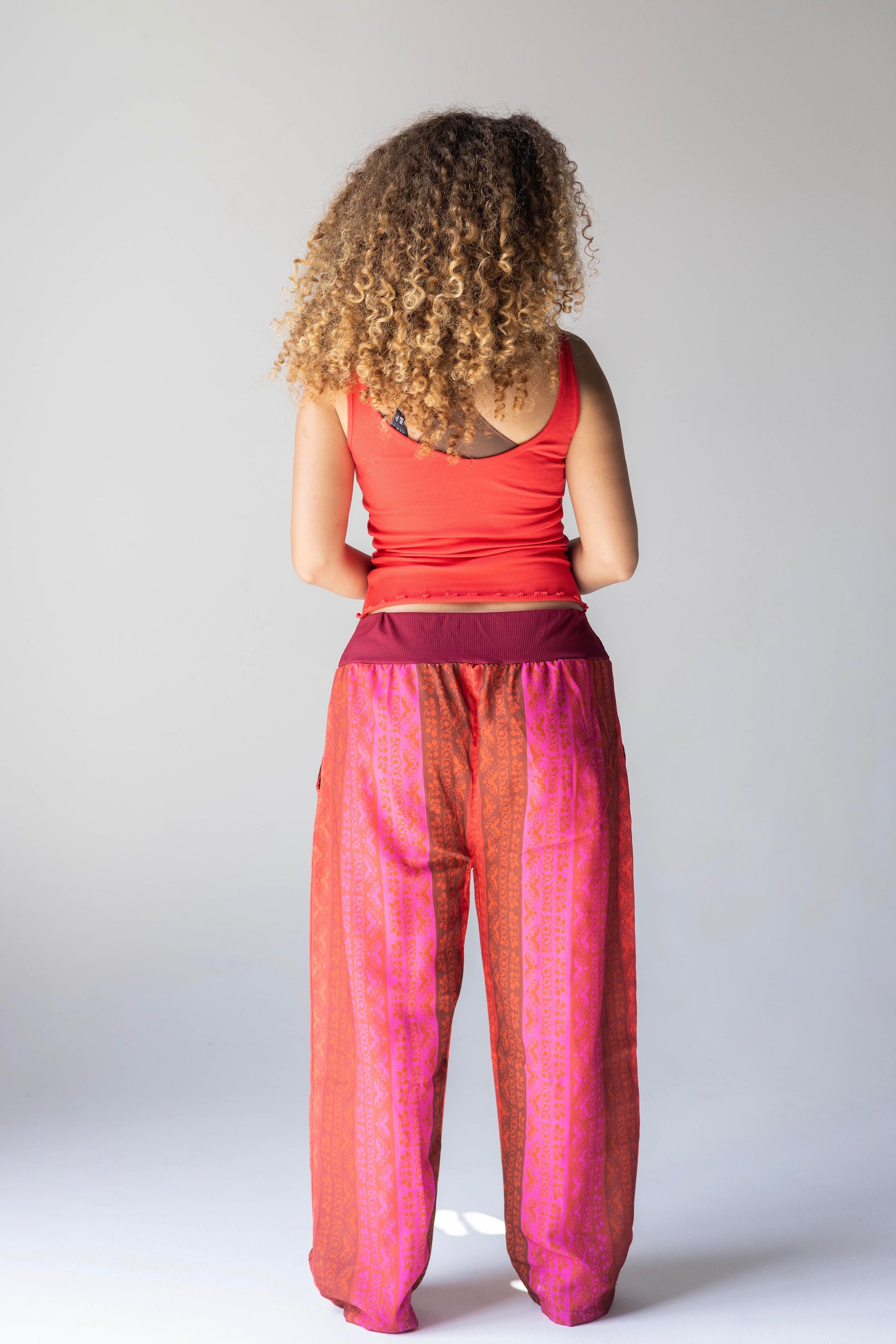 These striking pants are adorned with a striped pattern in red and fuchsia shades.The relaxed silhouette and elastic waist add a cool look, and happiness in every step.
