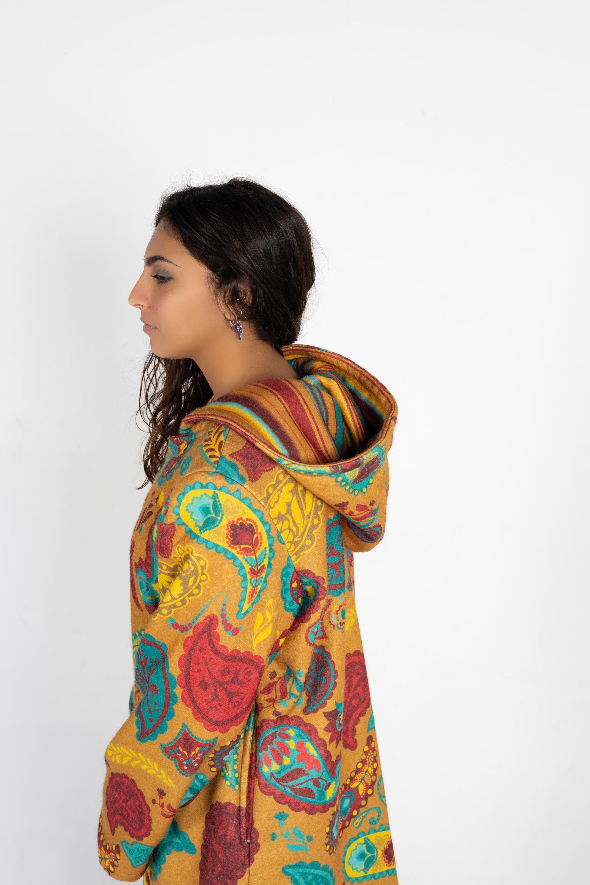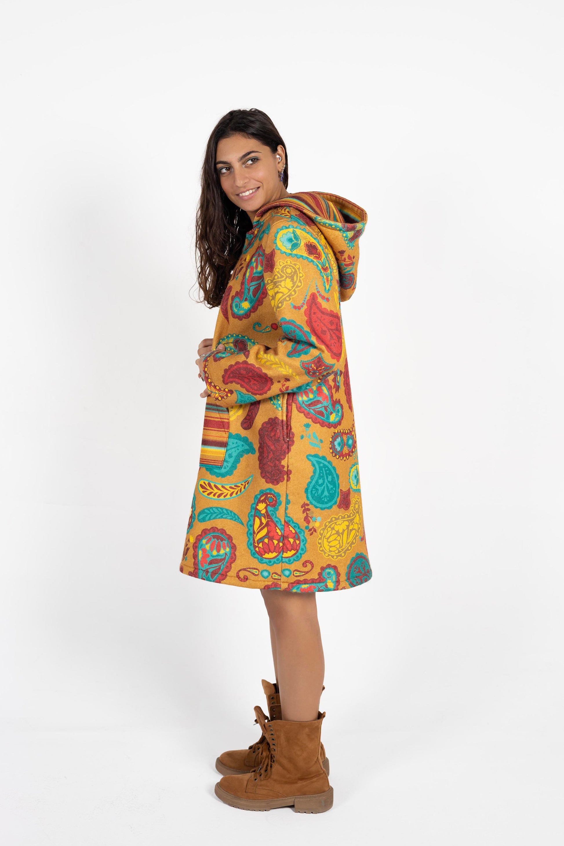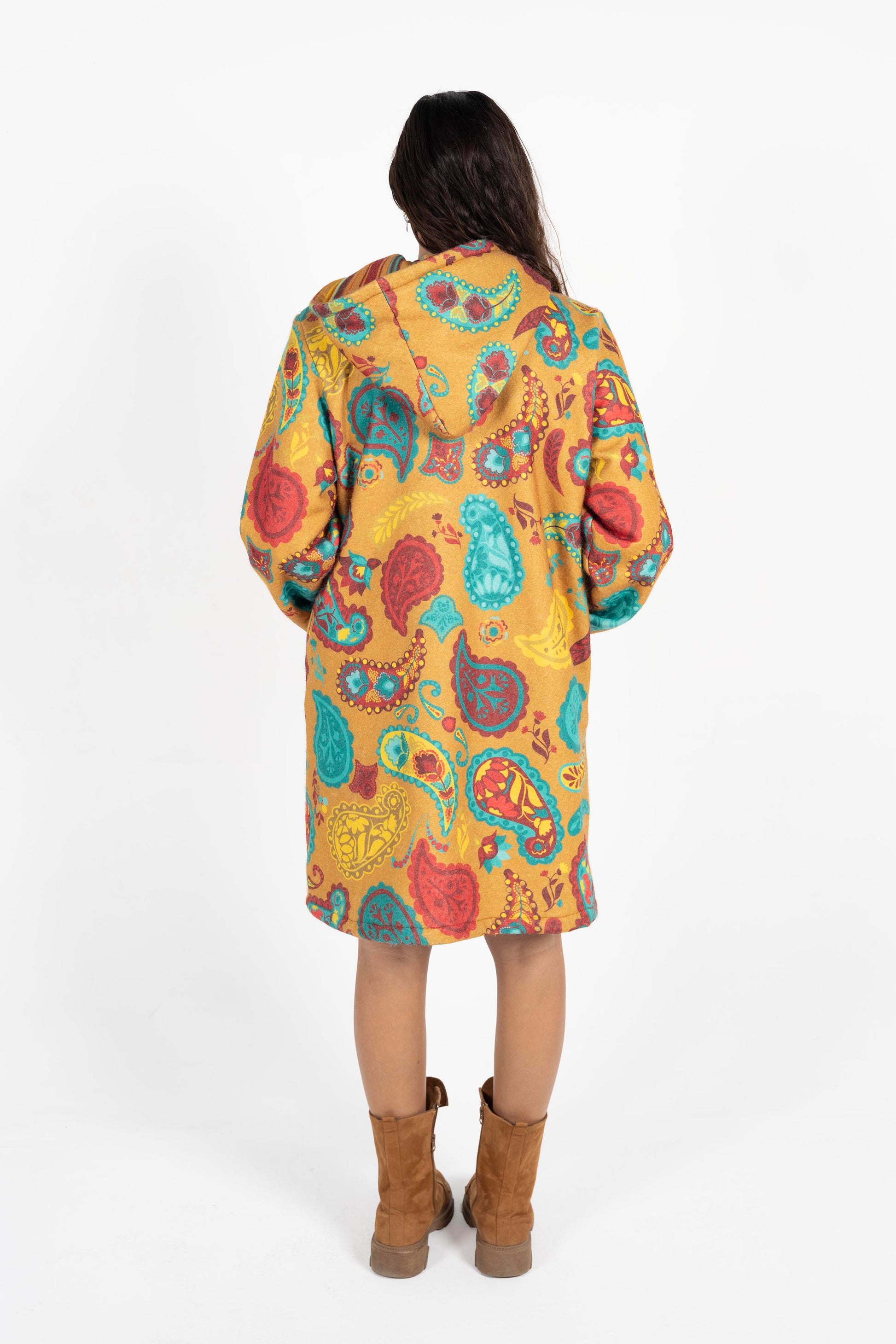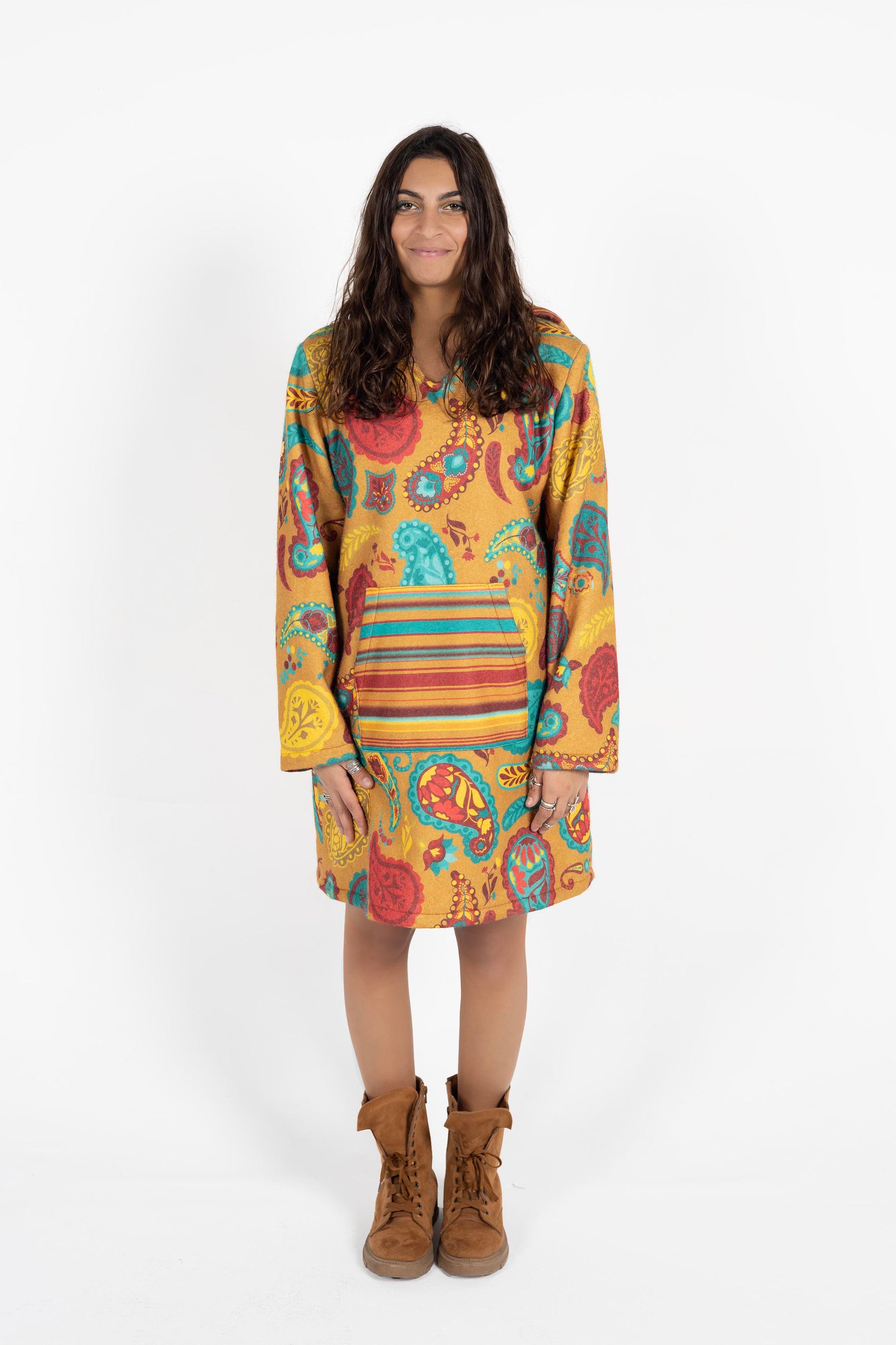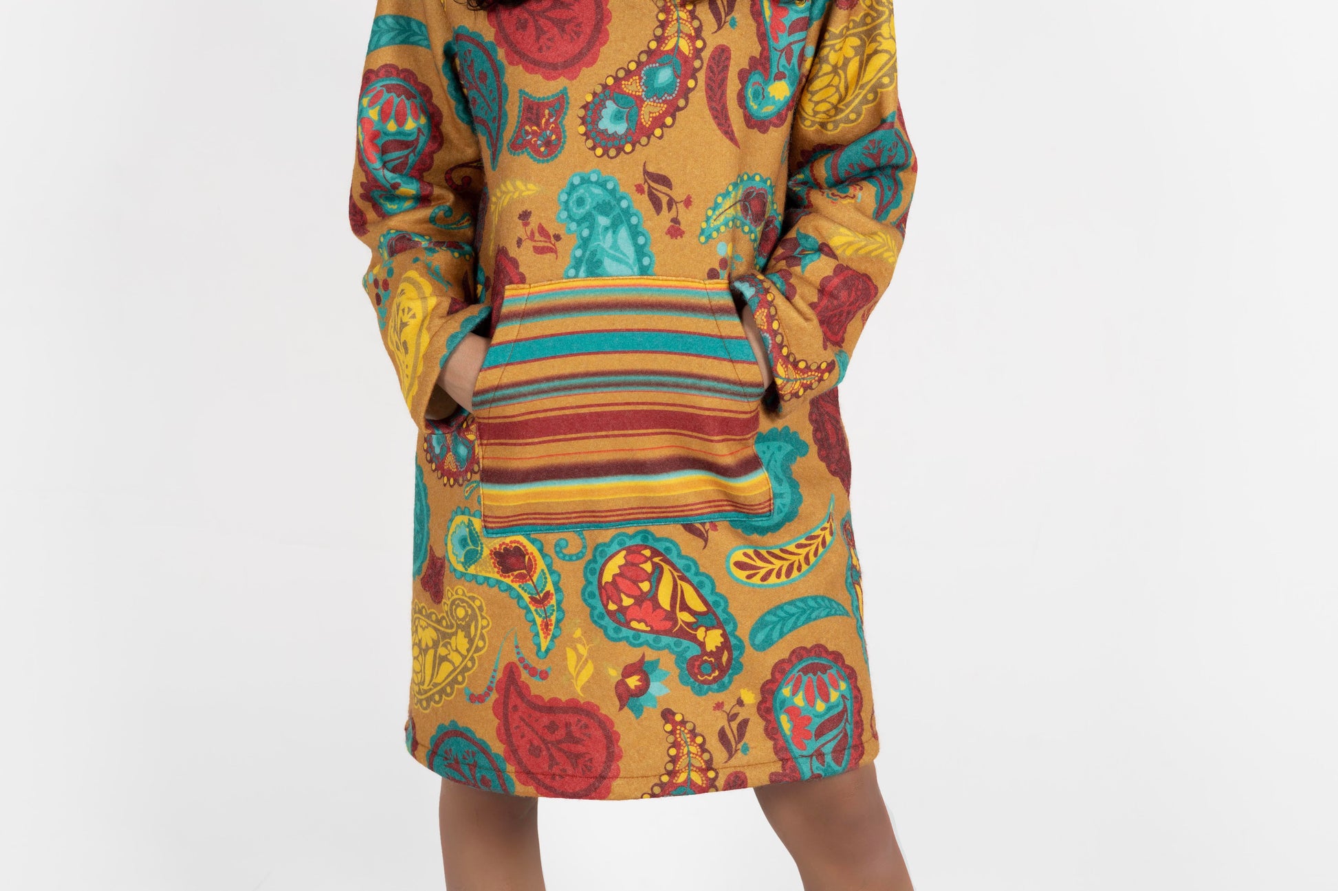 Who said that comfort never comes with style? The paisley dress is a fresh style for y’all free souls. It’s made of fleece fabrics, so it is like a warm hug from your favorite blanket – with long sleeves to keep you snug. It has two pockets from the sides, and one large striped pocket in the middle. It also has a hooded style for a cooler look yet warmer.