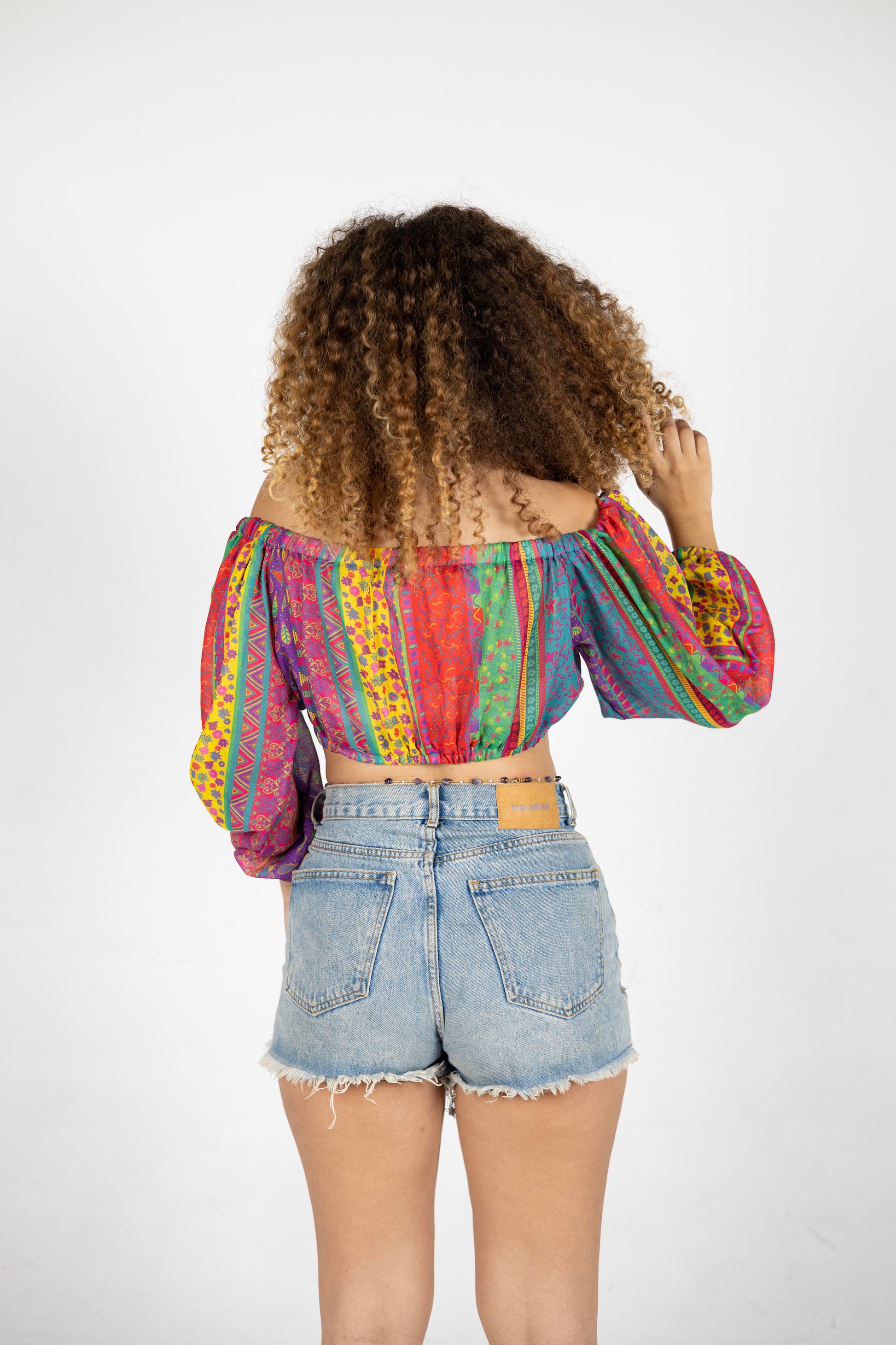 This Stropicolors Off Shoulder crop top is perfect for a tropical breezy evening. by the beach. The off shoulder silhouette graces your figure. The sleeves create a relaxed, yet eye-catching fit. This top is a true festive of color and carefree spirit.