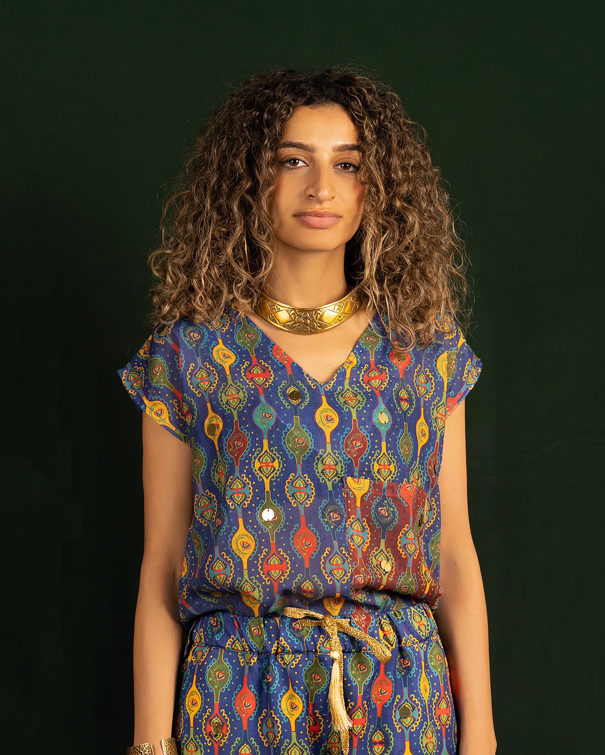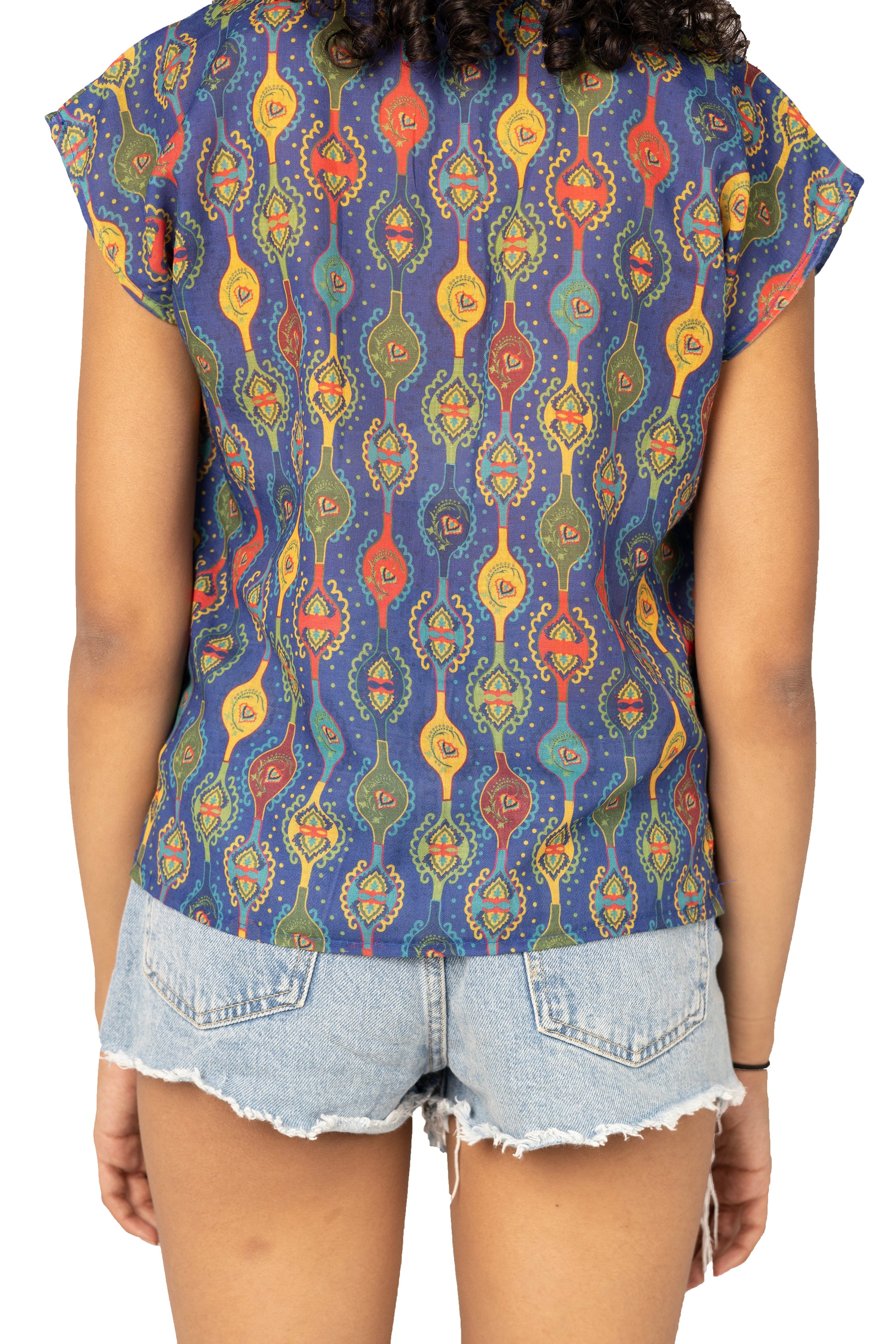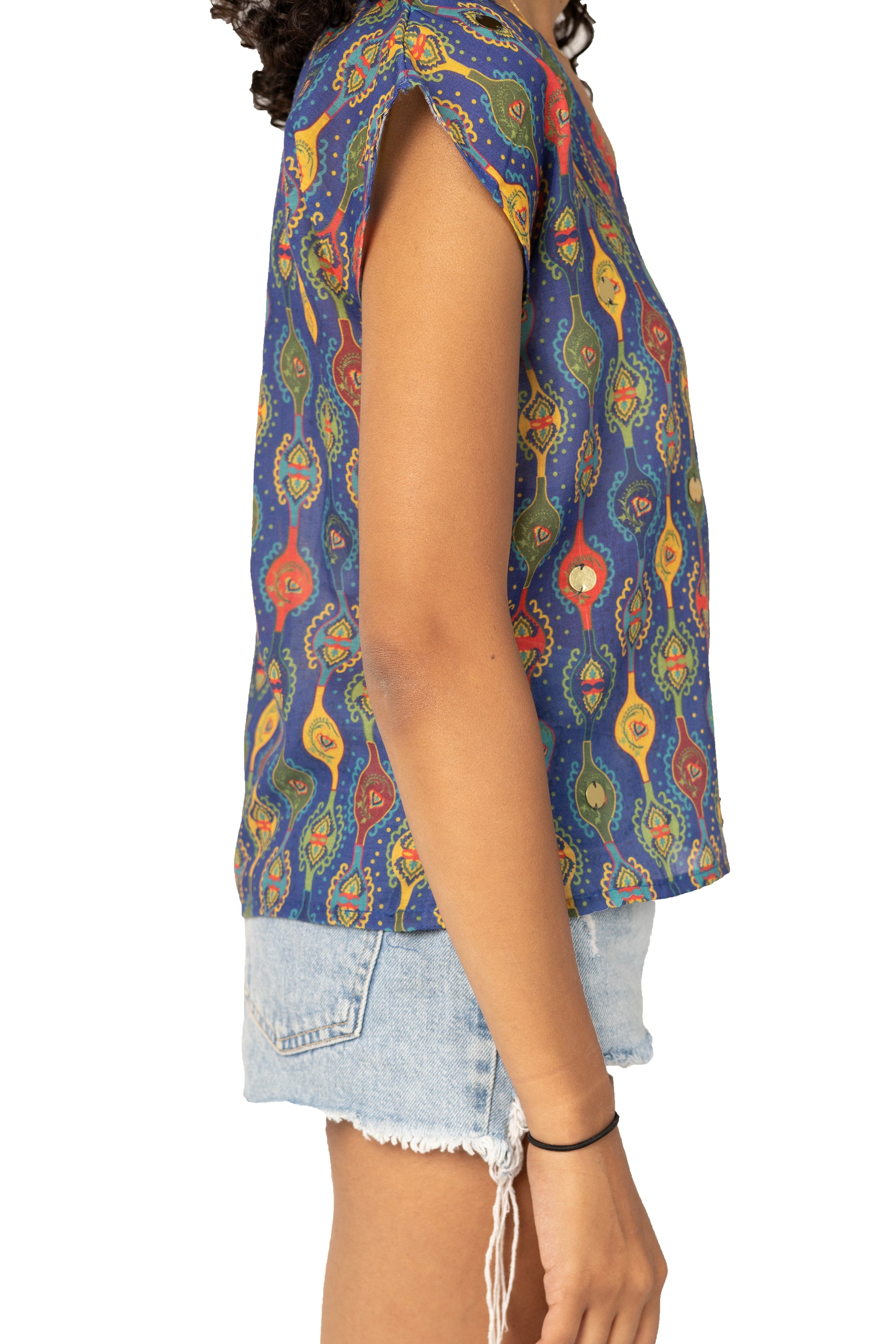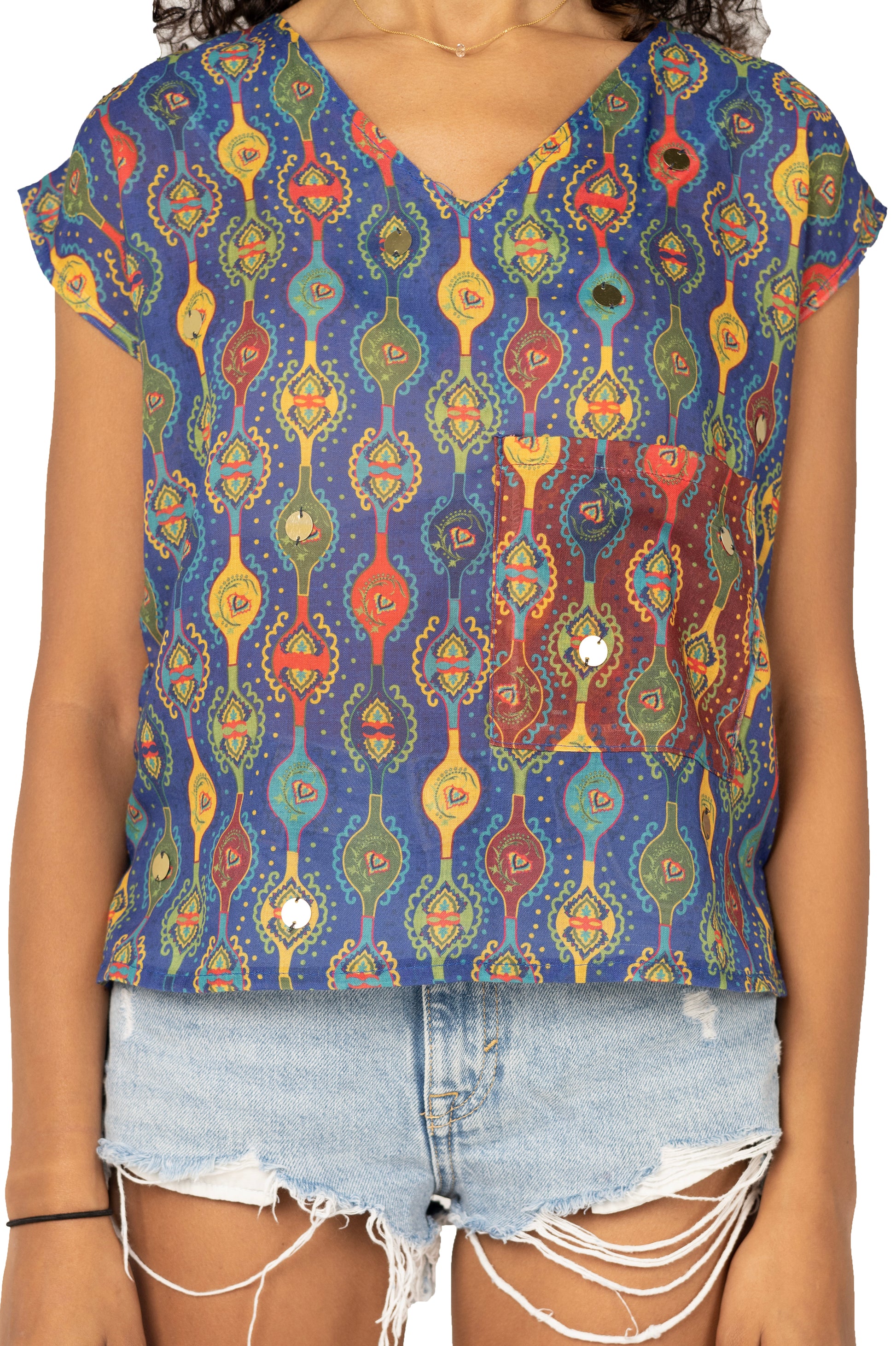 Our V Neck Beach Nights Blouse will make you stand out from the basic crowd. It has a cozy fit, and a pocket, all illustrated. It will match your colorful vibe during summer. They will perfectly match with plain pants with the same palette (but their boldest match are our pants). They also have dangly small copper discs for a shinier look.
