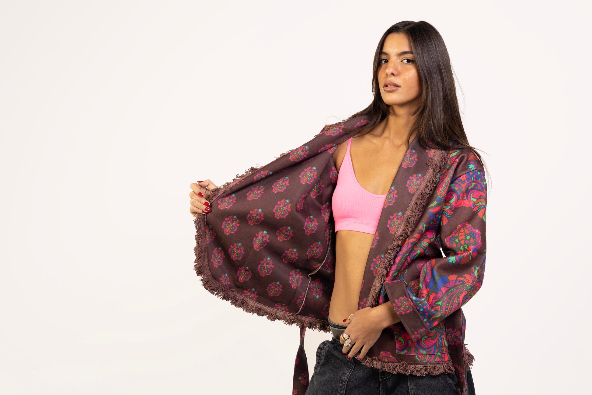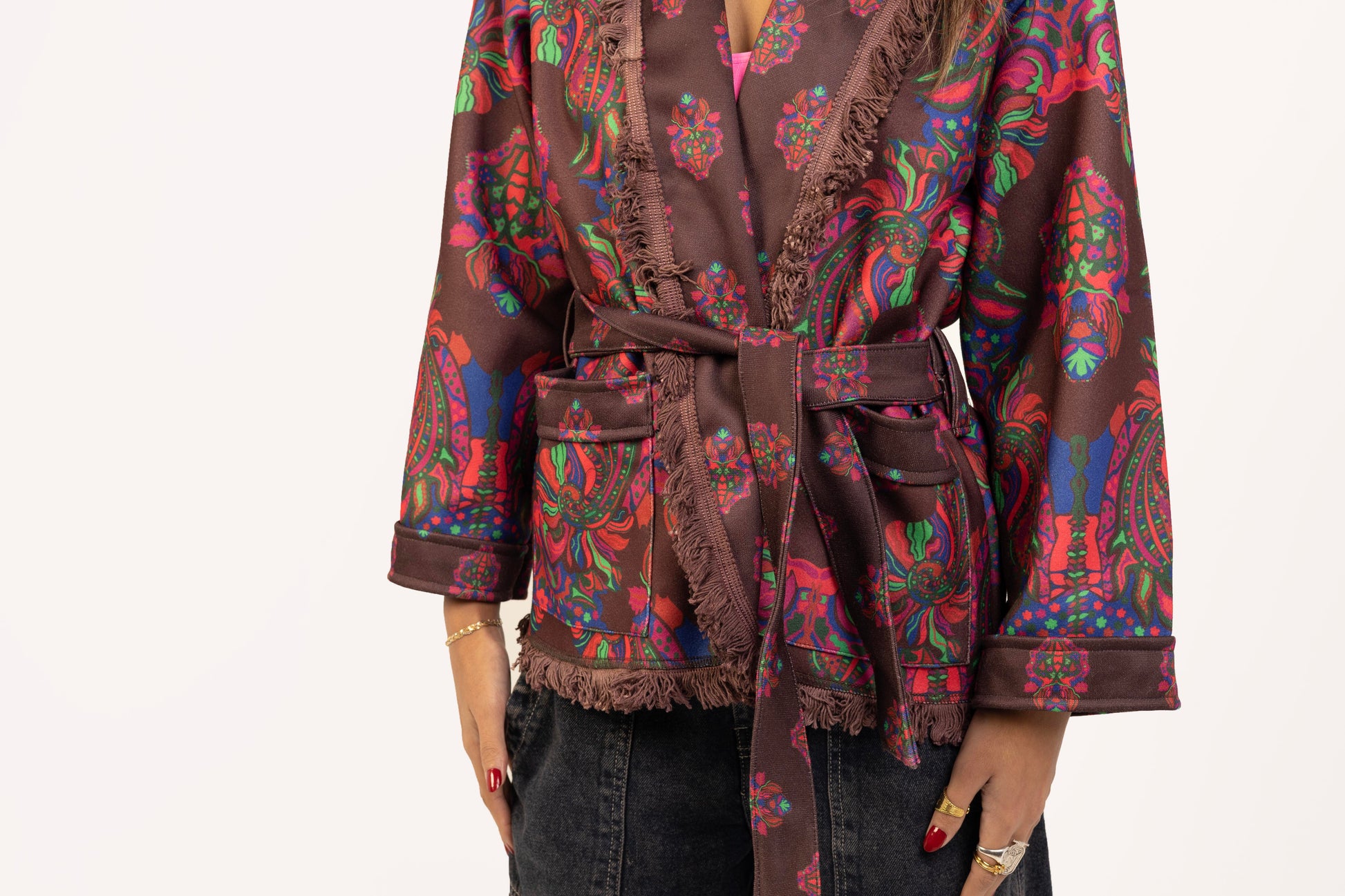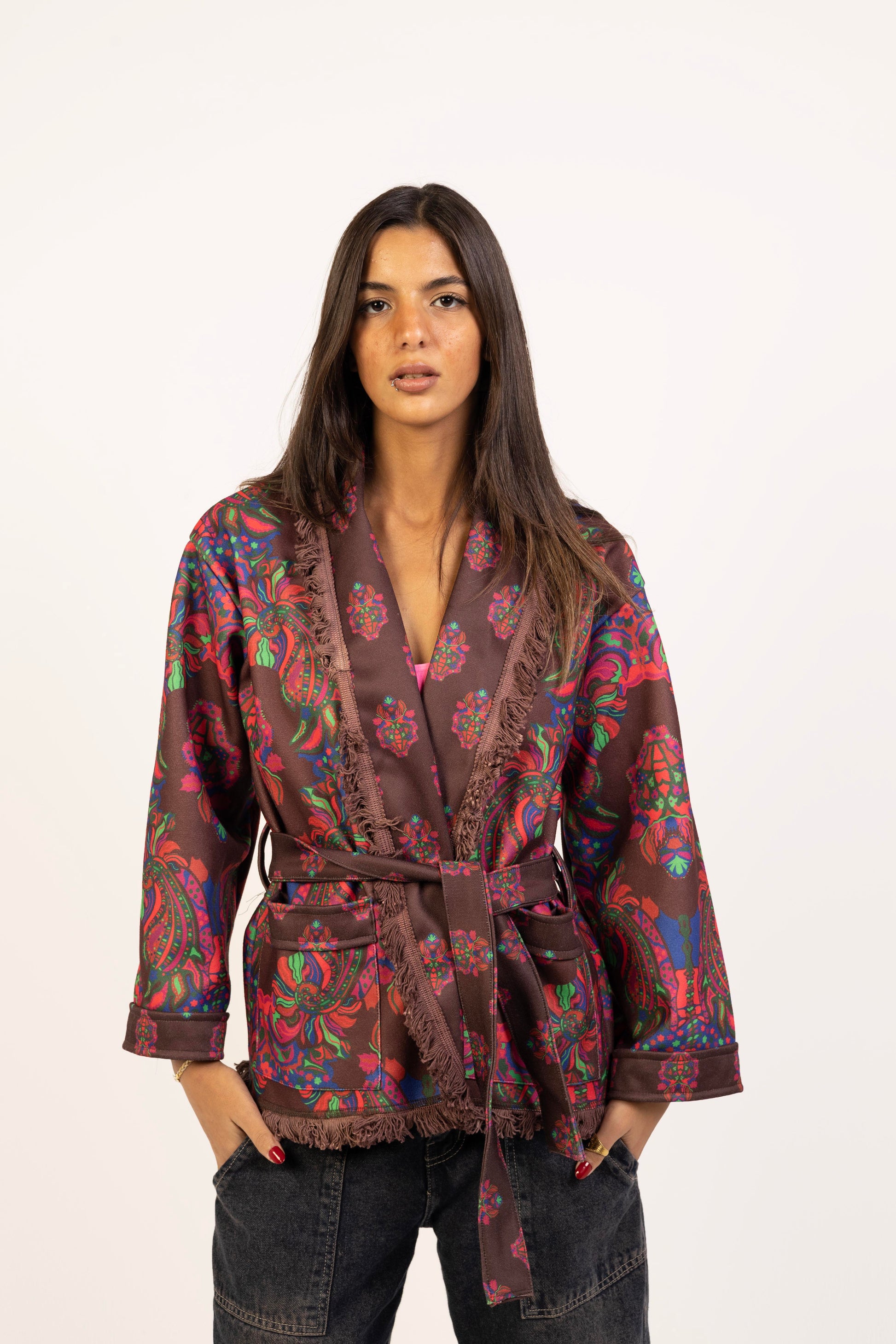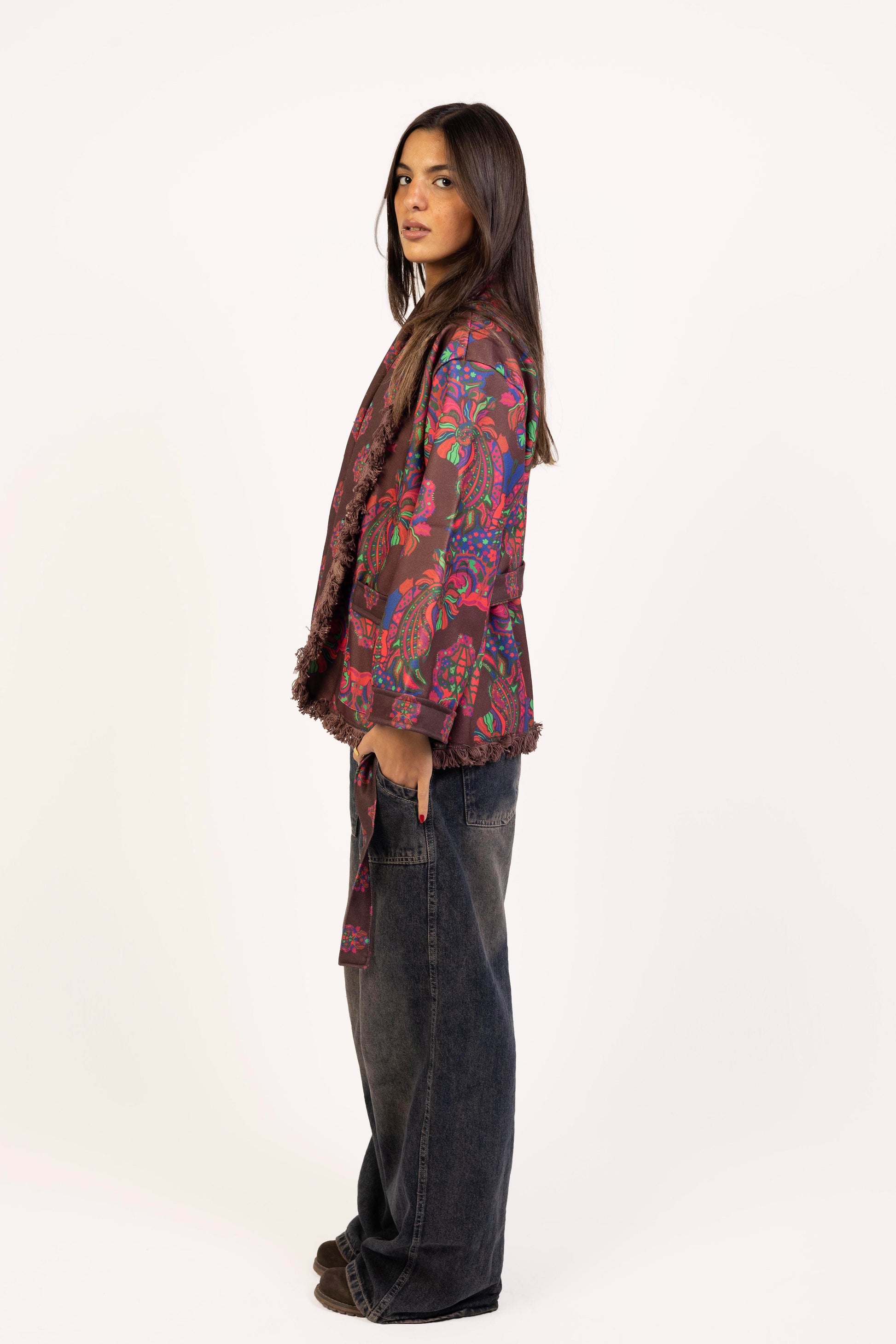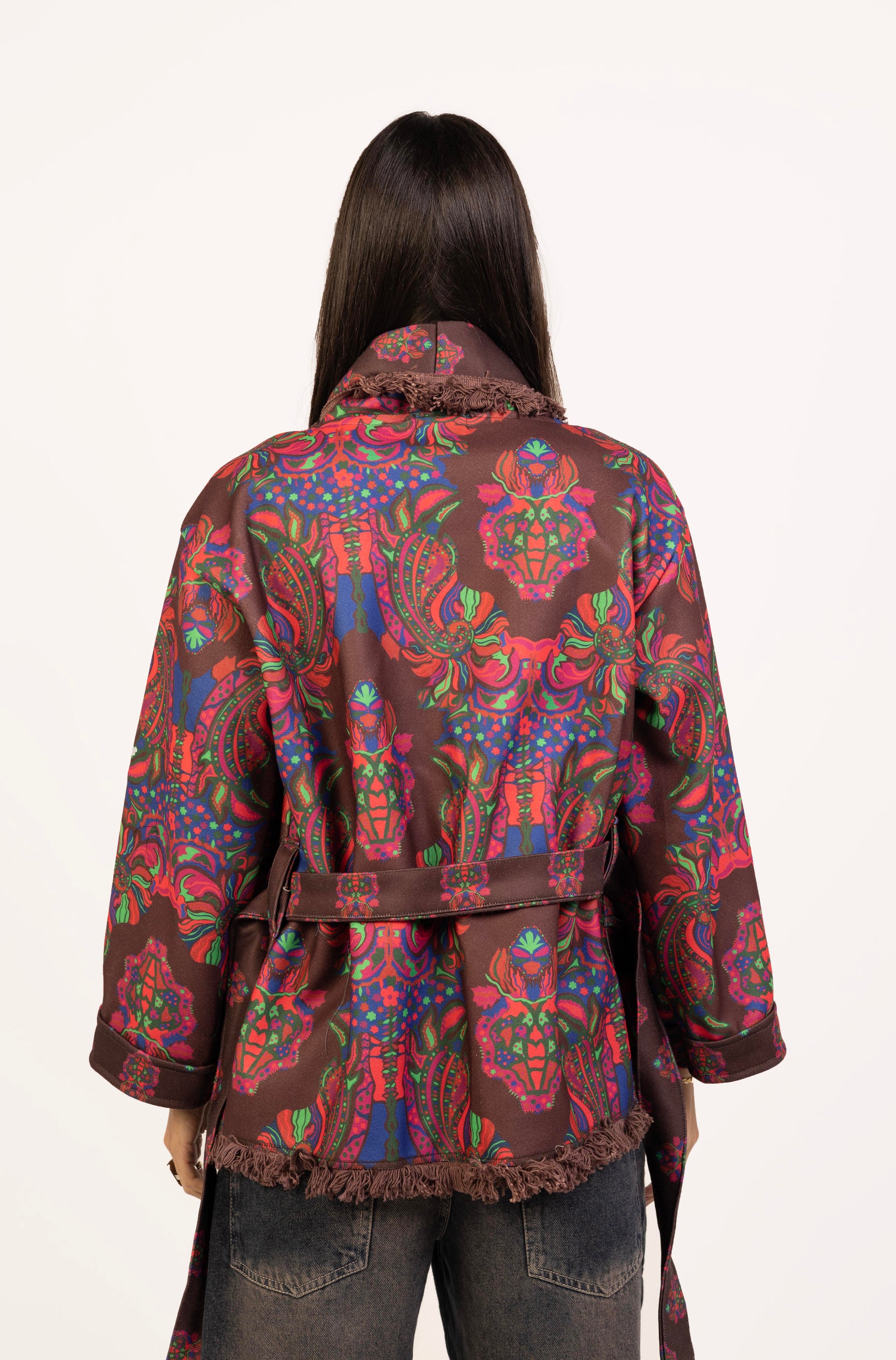 Embrace the chilly weather with the "Wine And Ginger Jacket", in which comfort and bold fashion are combined. It has a flattering collar neckline and a waist belt to create a silhouette that complements the body, and -not so long- sleeve. Adding brownish tassels to the edges for a more bohemian look.